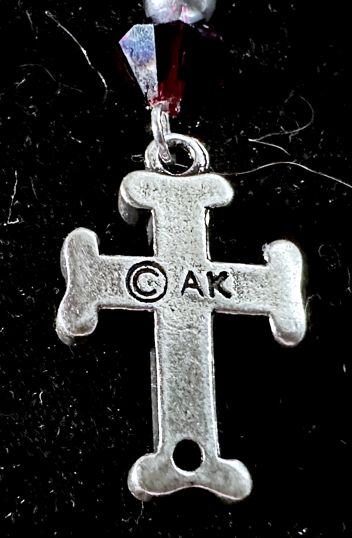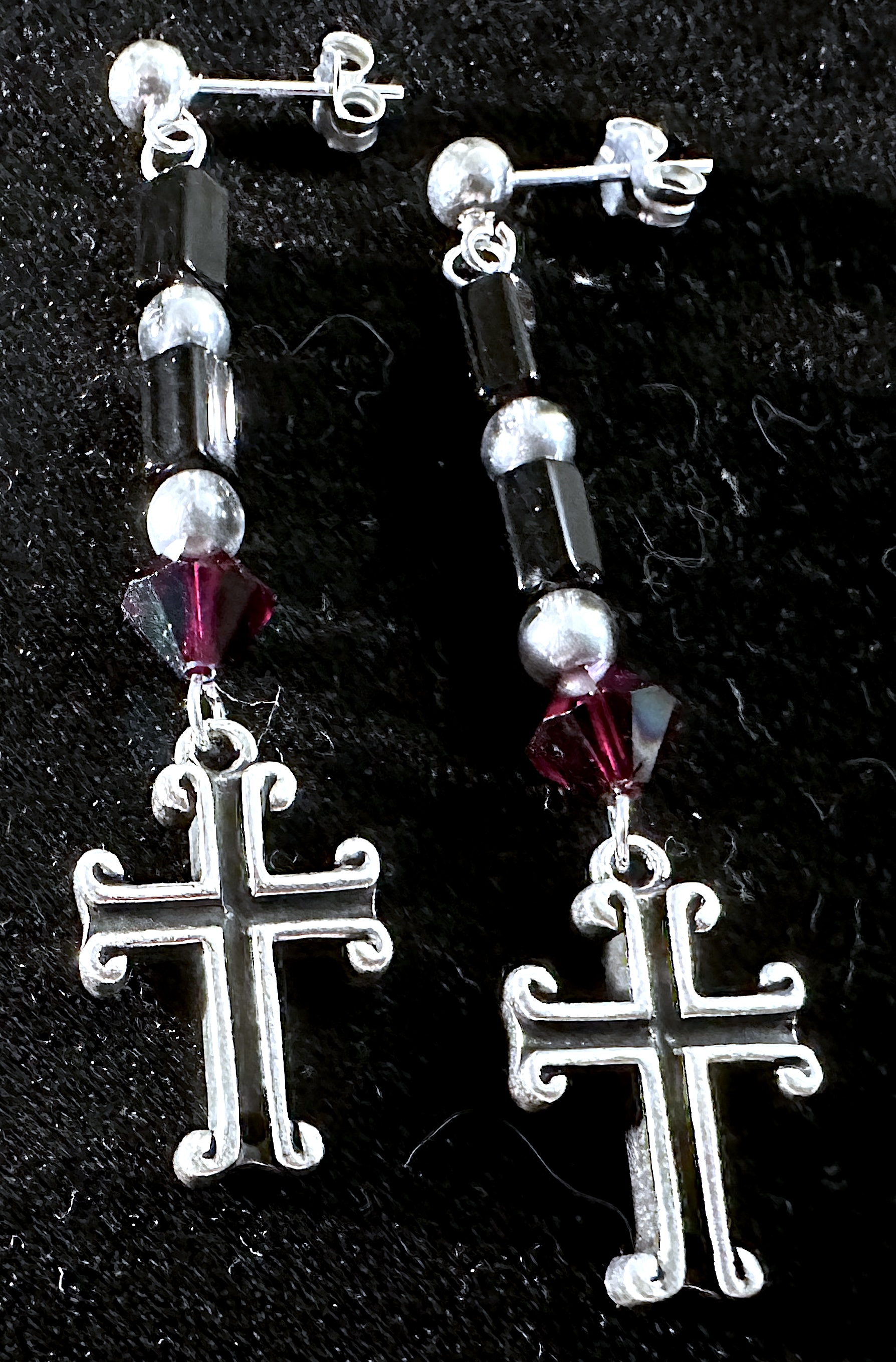 Designer made using Anne Klein Gothic Cross charms with dark Red Aurora Borealis Swarovski Crystals, Black Atlas and Czech beads on Sterling Silver 4mm Ball Post earrings. The cross design is perfect for any religious or Gothic-themed occasion. The earrings are made of 925 sterling silver and feature a butterfly closure for easy wear. Whether you're looking for a gift for yourself or someone else, these earrings are sure to impress. The intricate design and attention to detail make them a true work of art, and the beauty of the Gothic Cross charms and Swarovski crystals will make them a treasured addition to any jewelry collection. Don't miss out on the chance to own these unique and stylish earrings. Charms: .75 inches (19.05mm) Earrings: 2.25 inches (57.15mm) Charms: .75 inches (19.05mm)